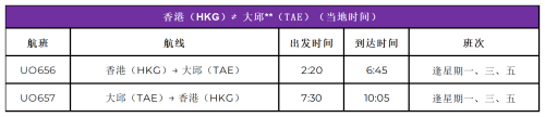 目前,香港快运是香港及大湾区唯一一家直飞韩国五大航点的航空公司(包括现有的首尔、釜山及济州航点)。清州、大邱航线开通后,大湾区游客将能够直飞韩国五大城市,仅需约三小时航程,即可抵达韩国各地景点。香港快运的多航点布局,为游客提供了多元化的出行选择,方便游客自由组合不同航点往返,搭配每周共54对航班,轻松规划多城市之旅,一切「游」你选择更多!